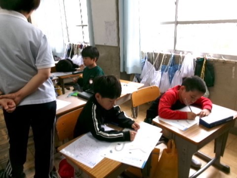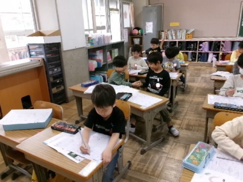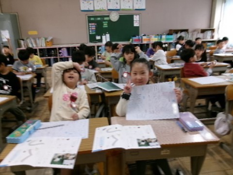 かたちがにている「く」と「つ」に気をつけながら,楽しく練習しています。先生から花丸をもらって嬉しそうです。