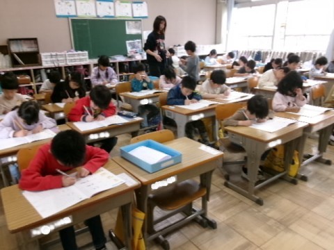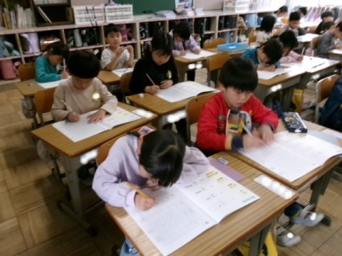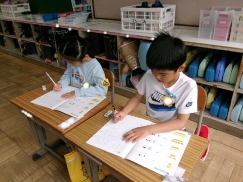 書き順や形を意識しながら,数字の「4」の練習をしています。先生に「じょうずにかけたね。」と声をかけてもらって嬉しそうです。