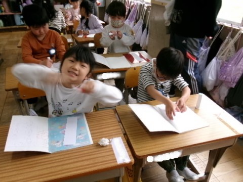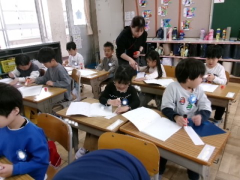「どうぞよろしく」の学習で,めあてをノートにはります。プリントにのりをつけ,丁寧にノートにはっています。