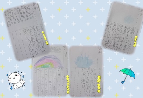「ザーザー」や「ピチャ,ピチャ」など雨の音を言葉にして,あめの情景や心の動きを詩に表しています。心が温まるほっこりした作品にかけています。