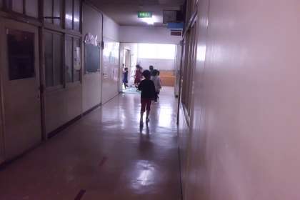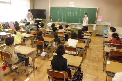 1組は,担任の先生と一緒に学校の中を見て回っていました。2組は国語で,線を引く練習をしていました。3組は特活で,対面式で話すあいさつの練習をしていました。