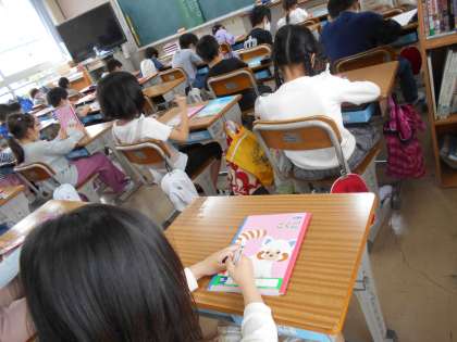今日から始まる清掃の仕方を確認したり,新しいノートやドリルに名前を記入したりしています。