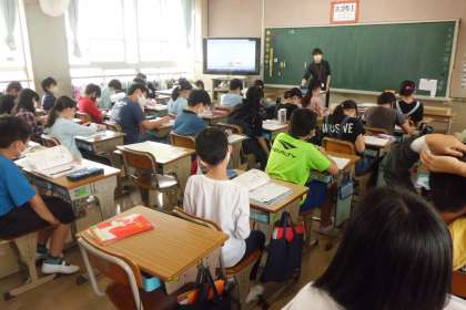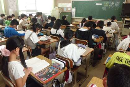 1組は算数で「分数のかけ算とわり算」の学習に入りました。2・3組は国語で,2組は新出漢字「腹・段・並」の学習の後,教科書を読んでいました。3組は専科による書写の学習でした。