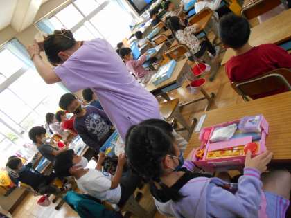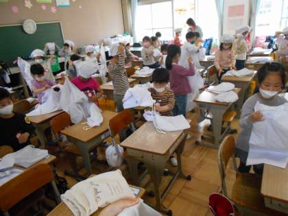明日から始まる給食のためにエプロンをつける練習をしています。他にもお道具箱に入っているものの確認もしています。