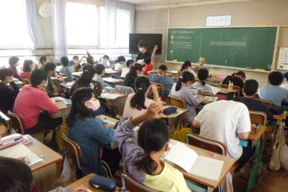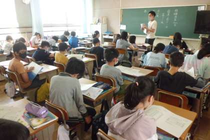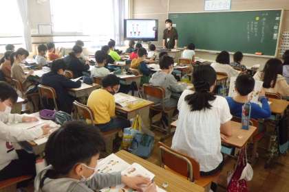 1組は算数で「0から9までの数字を1回だけ使って,10桁の一番小さい整数を作りましょう」という問題に挑戦していました。2組は特活で,プリントなどを配っているところでした。4組は国語で「教えて あなたのこと」の教材で友達へのインタビューをして友達紹介をするようです。