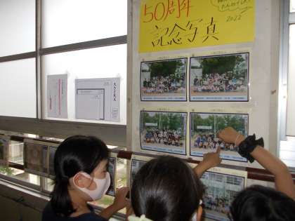 また,本校は今年度で創立50周年を迎えます。それを記念して4月に航空写真とクラス写真を撮影しました。各学年のろうかまたは階段に販売のためのを見本の掲示をしています。ご購入をご検討ください。申し込み用紙は懇談の際に各学級担任よりお渡しします。