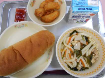 今日の給食は「コッペパン・牛乳・わかめうどん・長崎てんぷら・ミックスジャム」です。