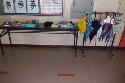 懇談会の日程に合わせ,昇降口に落とし物を並べています。この2ヶ月間にたまった落とし物です。持ち主が見つからないものは処分させていただきますので,持ち物には必ず記名をお願いします。