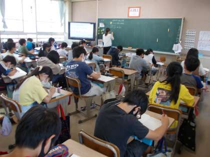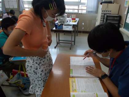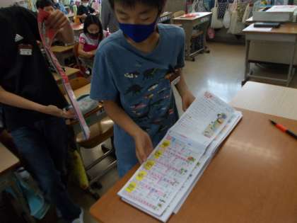 (上)長さが分数の長方形の面積の求め方を考えています。たてと横の長さが逆数になっているところがポイントです。(中)新出漢字の学習です。6年生にもなると画数の多い漢字がよく出ます。(下)分数のかけ算のまとめの問題を解き先生に見てもらっています。