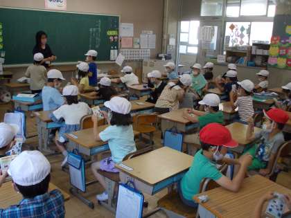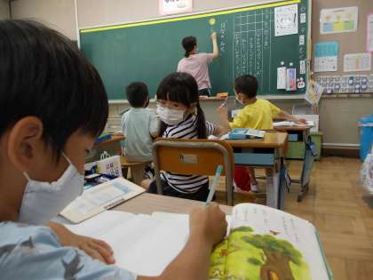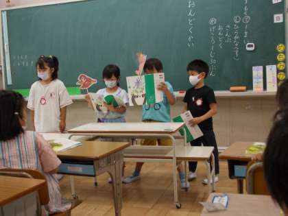 (写真上と中)国語「はなのみち」では音読げきをします。自分の役のセリフを考えたり,実際にげきをしているクラスもあります。(写真下)育てているアサガオに肥料を与えるようです。配られた肥料をじっとながめている子がいます。何を考えているのでしょう。