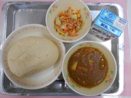 今日の給食は「オリーブパン・牛乳・ひよこ豆のカレーシチュー・ホットサラダ・手作りドレッシング」です。