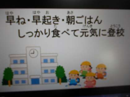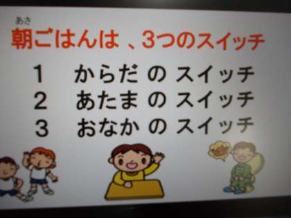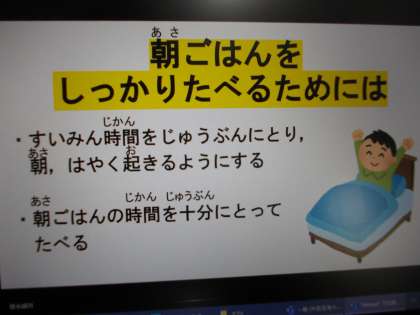 栄養教諭の先生から朝ごはんについての指導がありました。「なぜ朝ごはんを食べることが大切なのか」「食べないとどんなよくないことが起きてしまうのか」についてのお話でした。毎日しっかり栄養のバランスのとれた朝ごはんを食べて登校できるといいですね。