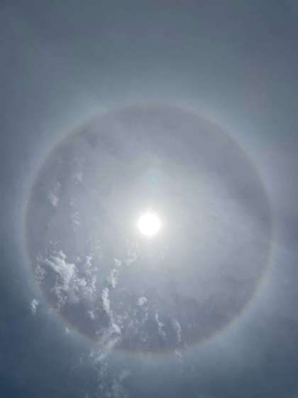 空を見ると不思議な、現象が起きています。写真では分かりにくいですが、太陽の周りに虹が出ていました。