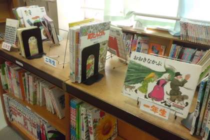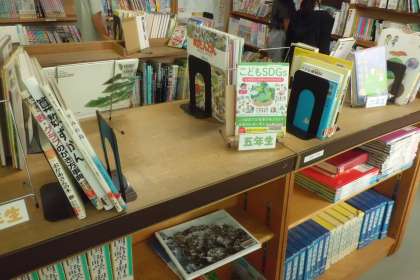 学年の学習に合わせた選書コーナーが設けられています。1・2・3年のコーナーでは「町たんけん」や「おおきなかぶ」の絵本,4・5・6年のコーナーには総合で取り組んでいる「SDGs」にかかわる本や算数の「表・グラフのかき方事典」などが配架されていました。