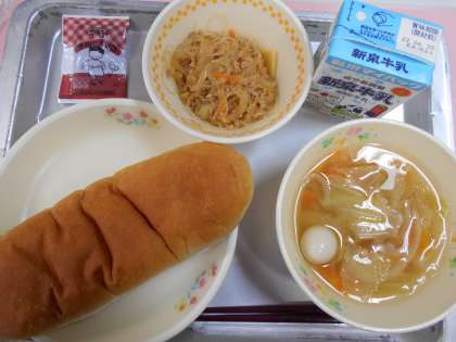 今日の給食は「コッペパン・牛乳・野菜スープ・マーボー春雨・チョコレートクリーム」です。
