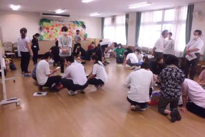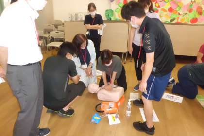 低・中・高学年に分かれて,胸骨の圧迫とAEDの使い方を練習しました。