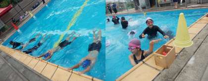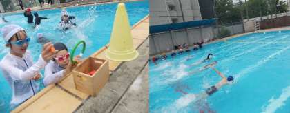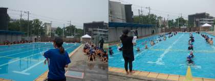 今年度はじめての学校水泳がはじまりました。気温,水温ともに28度となっています。3年ぶりの水泳ですので水慣れを中心に実施しています。6年生に聞くと「寒くない。」「ちょうどいい。」「気持ちいい」という声がかえってきました。