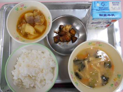 今日の給食は「ごはん・牛乳・五目汁・じゃがいものうま煮・なすの田楽」です。