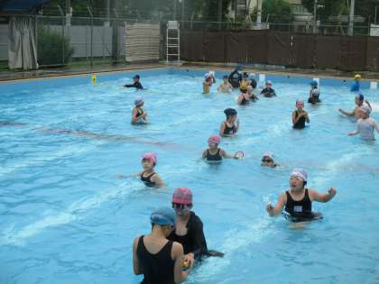 子どもたちは先生の話をしっかり聞いて,ルールを守っています。水に慣れてきたところで,体育参観で演技したダンスをプールの中で行いました。児童は音楽に合わせて,楽しく,演技していました。