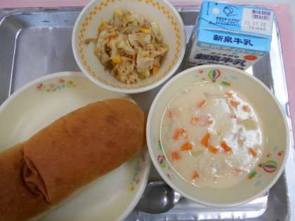 今日の給食は「コッペパン・牛乳・クリームシチュー・カムカムサラダ」です。