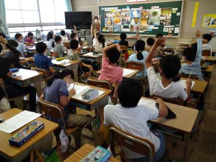 給食場から出るごみについての学習です。栄養教諭がT1で授業を進めていました。子供多阿知も一生懸命に学習に参加していました。