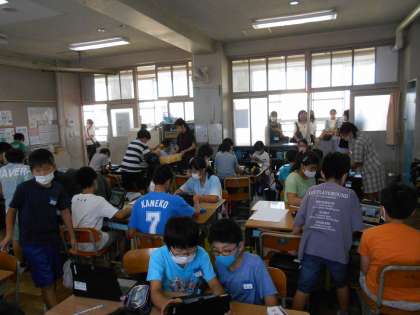 タブレットを活用して,コマ送り動画をそれぞれが作っています。少しずつ「ひよこの人形」の位置を変えて写真をとりそれらをつなげることで,そのひよこが動いているように見えます。班で工夫してオリジナルの映像を作成しました。仕上がった映像は保護者の方にも見て頂きました。