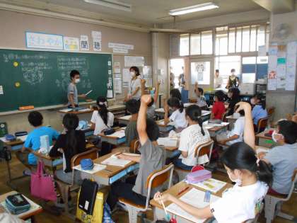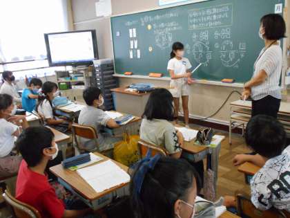 分数は,分母と分子に同じ数をかけても,同じ数でわっても大きさは変わらず,元の分数と等しいことを学んでいます。とても分かりやすく前で説明できている子がいました。