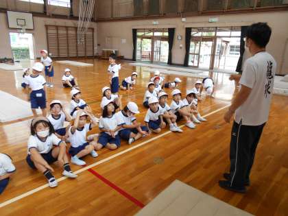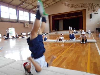 1組は体育でマット運動をしています。先生のお手本を見て技の名前を知り,何度もチャレンジしています。