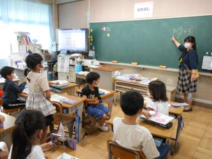 2組は算数で「6−4+5」の式になるお話を考えています。