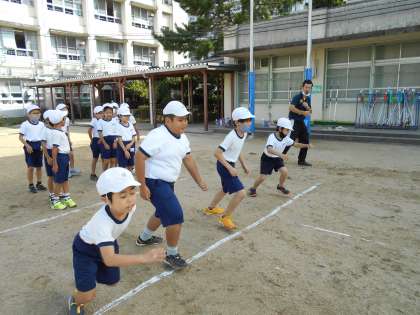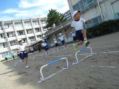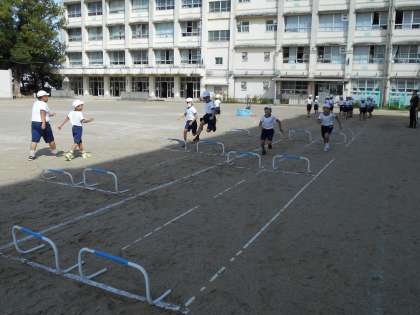 ミニハードルを使ってリズムよく,とび越えています。いつも同じ足で跳べると心地良さを感じます。