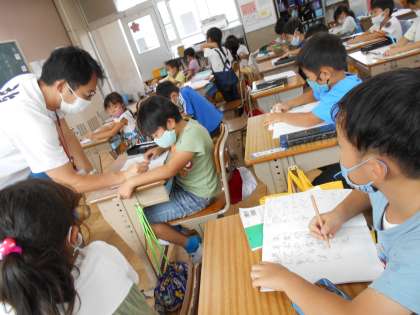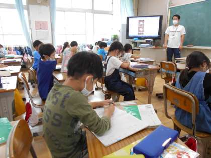 「うみのかくれんぼ」の学習です。問いに対する答えを探しながら,ノートに書いています。黒板の字をノートにすらすら書けるようになってきています。