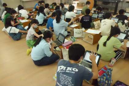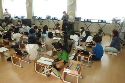 音楽の公開授業の様子です。スクラッチを使って,オリジナルの旋律とそれに合わせたリズムを考えていました。素敵な旋律ができていました。