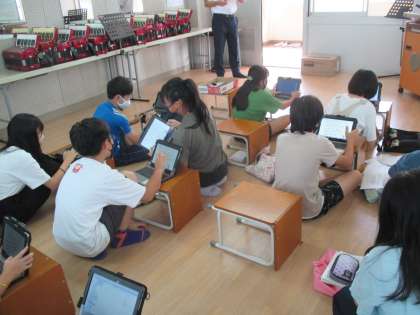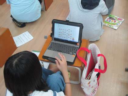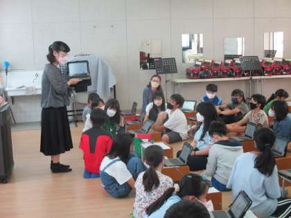 1組の音楽の授業です。「いろいろな和音のひびきを感じ取ろう」で,タブレットを使って,2分音符の部分のリズムを変えて,オリジナルの旋律をつくりました。作った旋律が,自分尾イメージにあったものになるよう,リズムを工夫しました。
