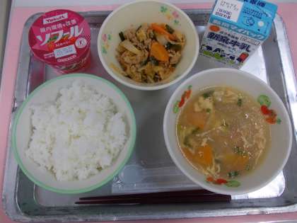 今日の給食は「ごはん・牛乳・トック・豚キムチ・ヨーグルト(いちご)」です。