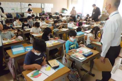2年が算数で校内授業研を行いました。20の図形を2つに仲間分けする学習です。子供たちは戸惑いながらも一生懸命に分けていました。