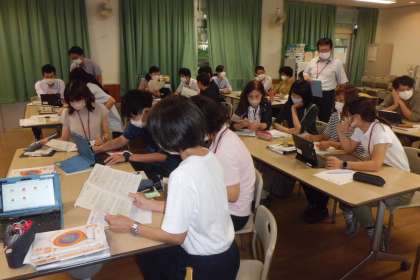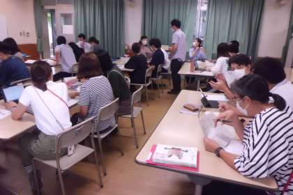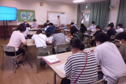 授業を参観した後,ランチルームで討議会を行いました。太成学院大学の中村教授にご指導をいただきました。