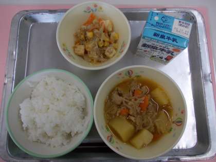 今日の給食は「ごはん・牛乳・肉じゃが・豆腐サラダ」です。