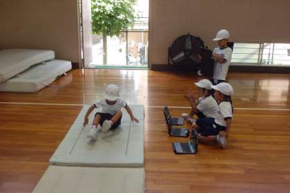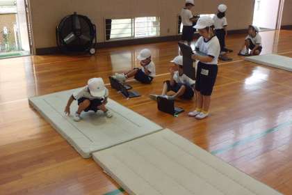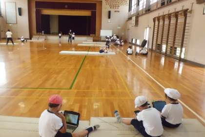 1組の体育館体育の様子です。タブレットで友達の前転の様子を撮影しています。自分の動きを確かめている子もいました。少しずつタブレットの使い方をマスターしてくださいね。