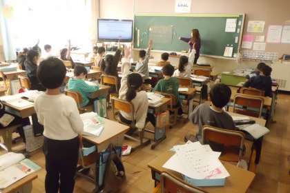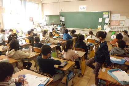 1組は体育で、ボールを使って、ドリブルで1対1のゲームをしていました。2・3組は算数で、2組はテスト直し、3組は20+30の計算の仕方について考えていました。