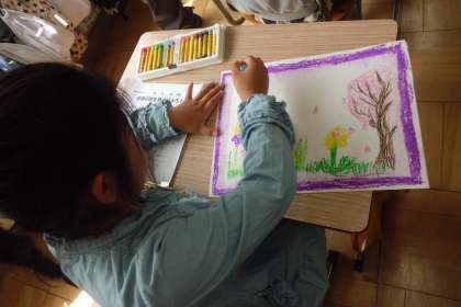 今日のめあては「かばんの中に花を大きくたくさんかこう」です。
