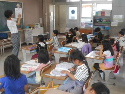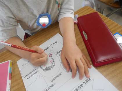 自己紹介カードを作っています。真ん中に自分の顔を書き、その周りに好きなことを書きます。何をするのも楽しそうで、いきいきと活動できています。