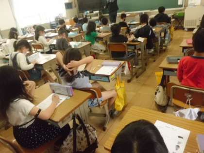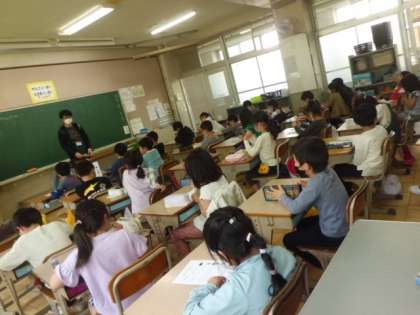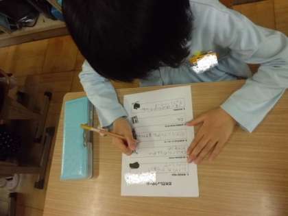 「だれでしょうゲーム」をするためにヒントになる自分のことをカードに記入しています。