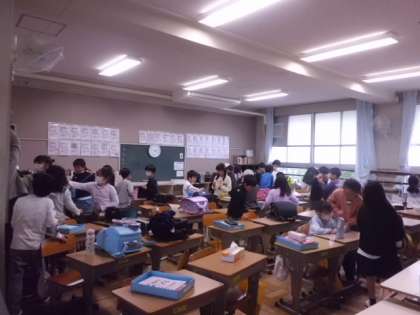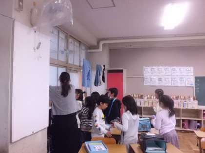 教室には、朝に濡れてしまった靴下や衣類が干してありました。