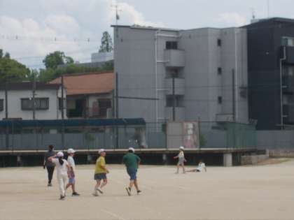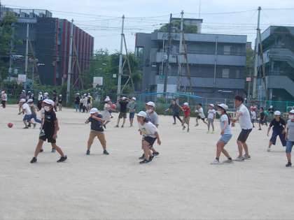 ドッジビーやだるまさんがころんだ、バスケットボールをしています。