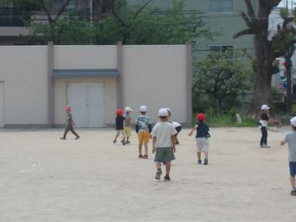 今日は、お天気が良いので運動場へ出て元気に遊んでいます。先生も一緒です。