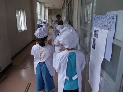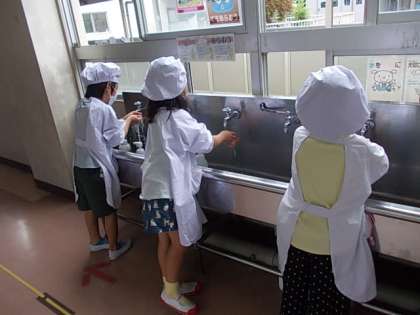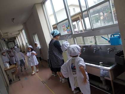 学習が終わって給食の準備です。しっかり手を洗っています。