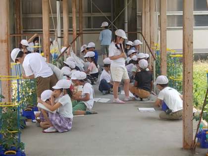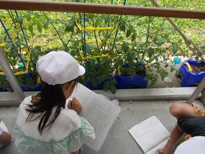 育てている夏野菜の観察をしてメモを取っていました。