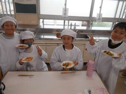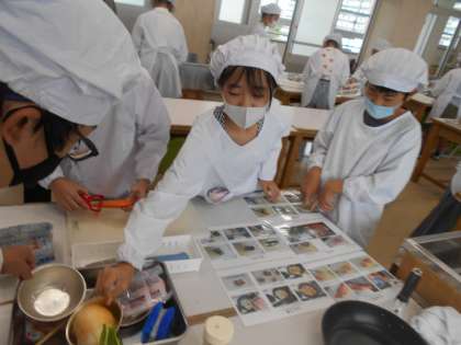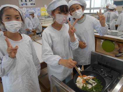 今日は3組が調理実習にチャレンジしています。声をかけ合い、手際よくどんどん進めることができています。安全にも気を付けて美味しそうな野菜炒めができあがっています。