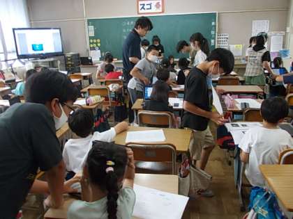 1年生のタブレット操作のお手伝いを一緒にしています。