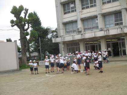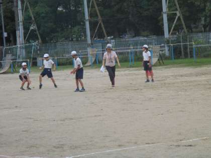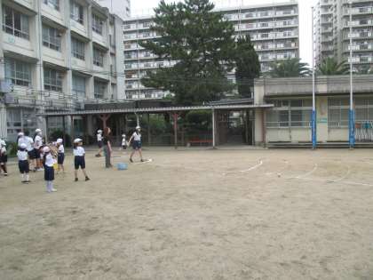 運動場ではソフトボール投げを行っていますが、6年生男子には40m以上投げる児童もいて、歓声が起こっています。